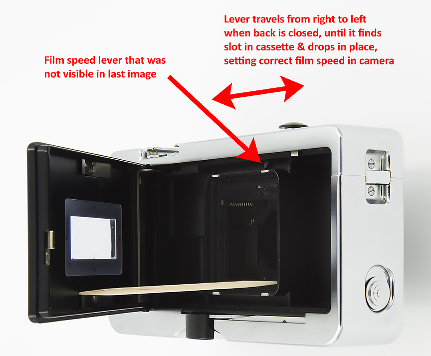 The Model 500, was designed for the more descriminating photographer. As such, accounting for film speed was considered necessary and expected. This was accomplished on the 126 cassette with a slot cut into the outside of the cartridge. Placement of that slot, referenced the speed of the film inside the cassette. The 500 had a lever that found the "slot" in the cartridge when the camera back was closed, locking in the correct film speed. The images below further explain how this interaction worked.