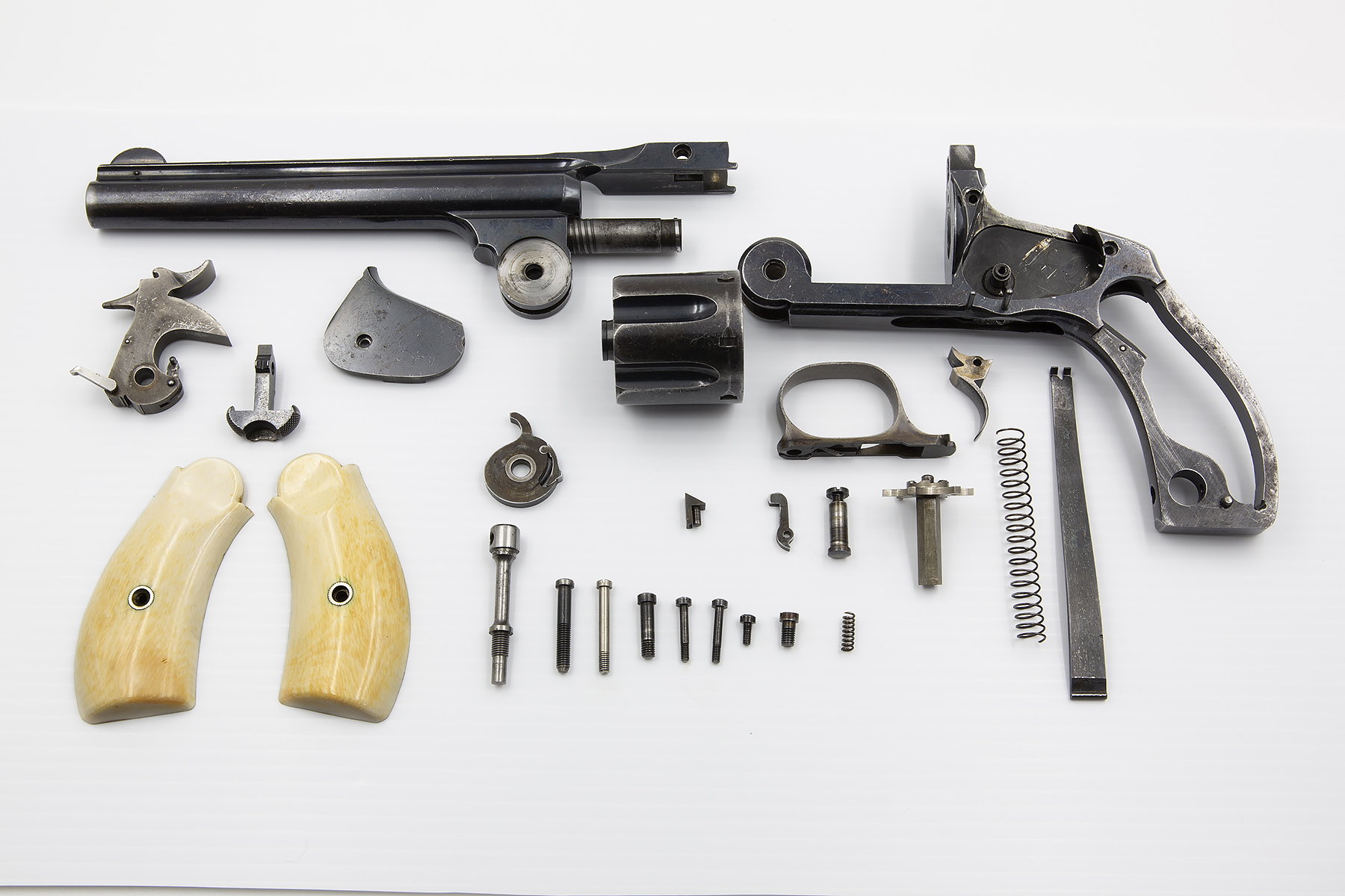 How often does one get to see the insides of a 126 year old revolver? This image is of this revolver after my initial breakdown and before any cleaning or degreasing. Really very clean considering that it is believed to have been at least 55 years since it was last disassembled. Zoom in for a closer look (Some parts were not fully disassembled)............
